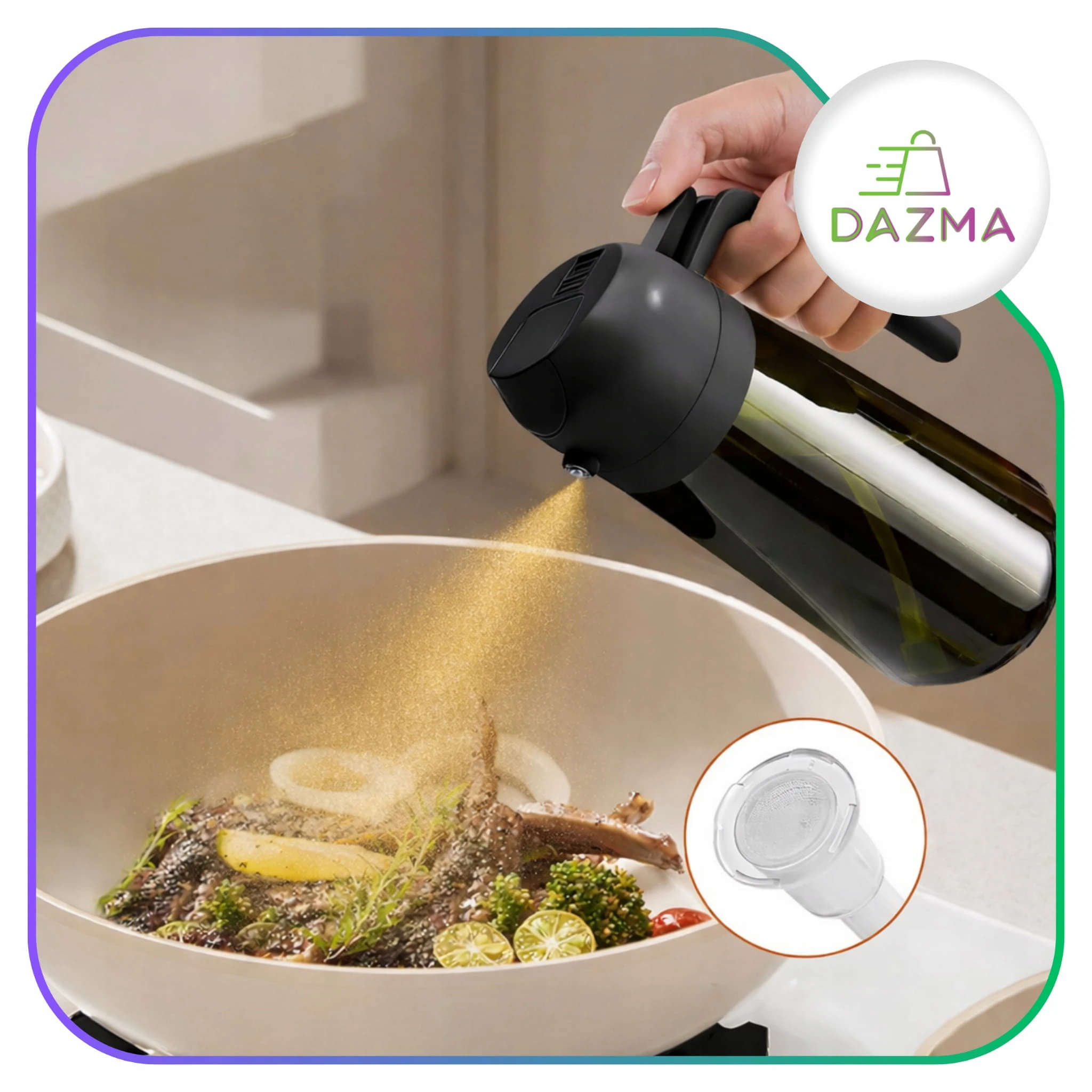 Spryskiwacz tworzy delikatną mgiełkę, dzięki czemu olej rozprowadza się równomiernie i nie wylewa się go za dużo.